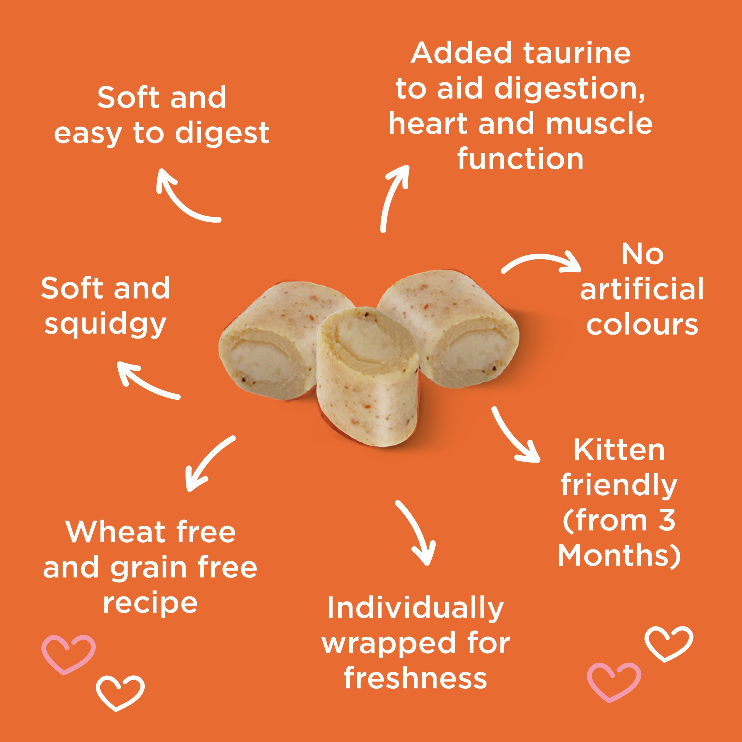 Fresh drinking water should be provided at all times. The quantities shown above should be used as a guideline only. Please adjust the amount given to keep your cat in a lean, active condition. Caution: For cats from 3 months old only. Always supervise your cat when feeding treats. Where necessary break into smaller pieces for small cats and kittens.