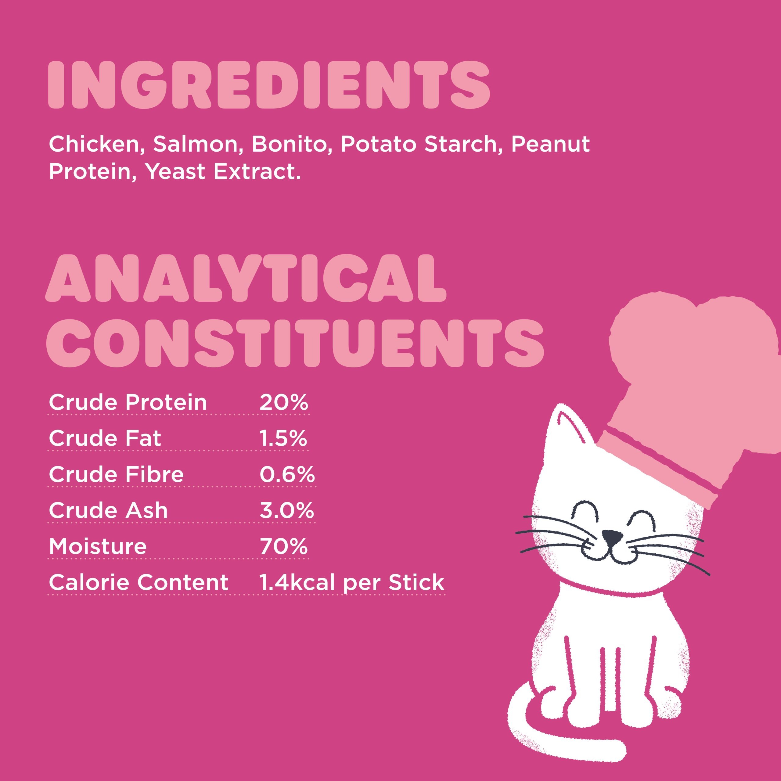 Chicken, Salmon, Bonito, Potato Starch, Peanut Protein, Yeast Extract.