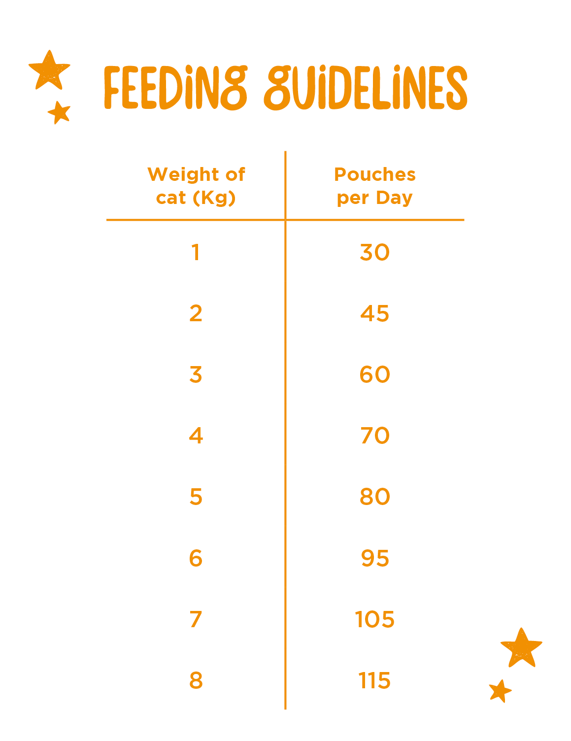 The quantities shown should be used as a guideline only. Every cat’s appetite is different depending upon size, age, condition and level of activity. Please adjust the amount given to keep your cat in a lean, active condition. Fresh drinking water should be provided at all times.