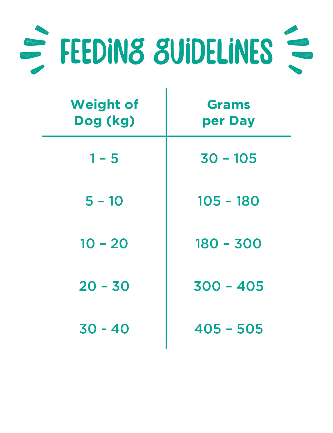The quantities shown should be used as a guideline only. Every dog’s appetite is different depending upon size, age, condition and level of activity. Please adjust the amount given to keep your dog in a lean, active condition.